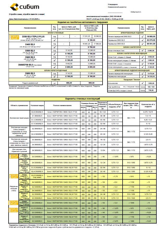 Актуальный прайс-лист на стеновые и перегородочные блоки, перемычки и плиты перекрытий из автоклавного газобетона СИБИТ